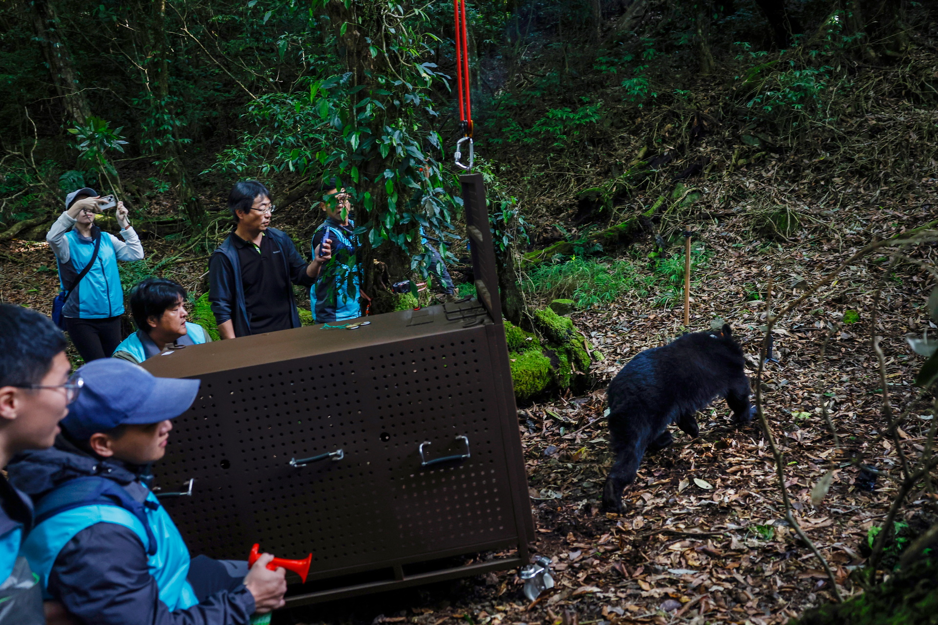 As the cage holding an endangered Formosan black bear swung open conservationists blasted gunshots and air horns to ensure the frightened young bear disappeared quickly into the mountains of central Taiwan, hopefully far from human contact.
