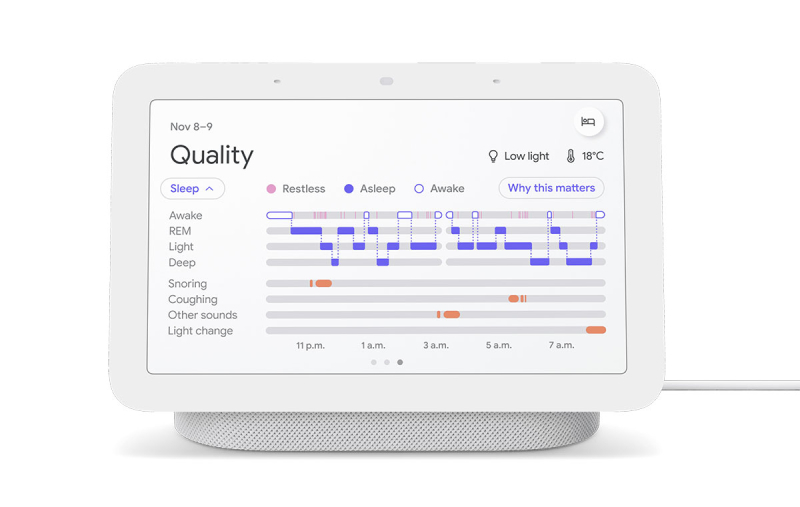 After waking up, you can track the quality of your sleep through a timeline view. All this through microphones, ambient light sensors and a new temperature sensor, without a single camera used.