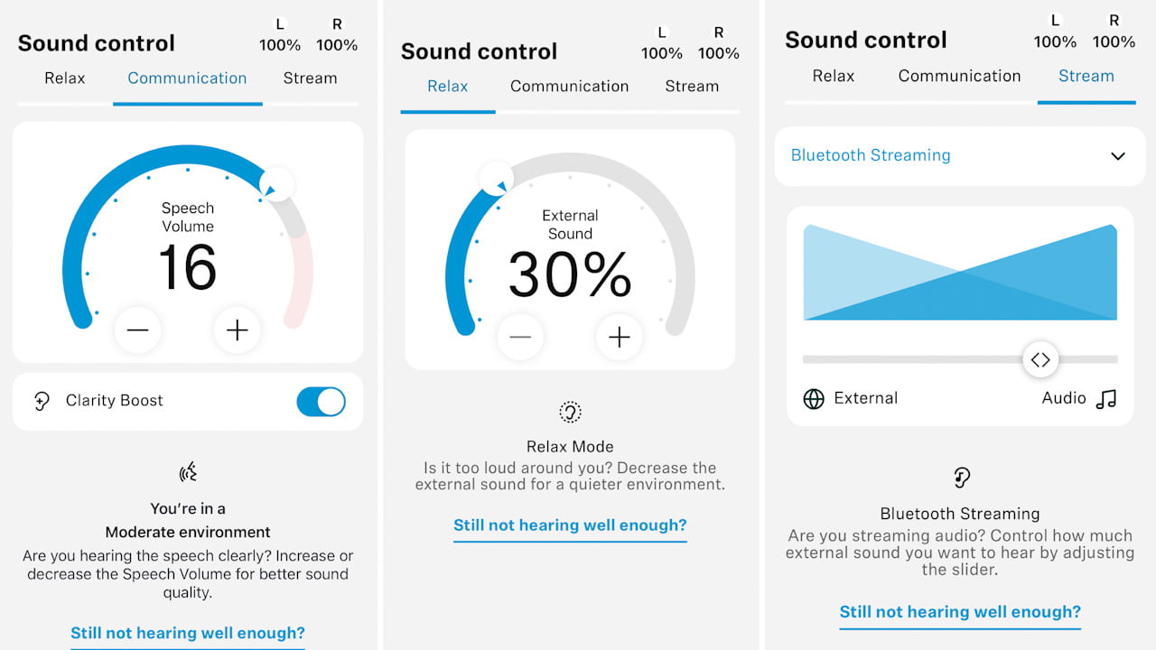 By default the app offers three distinct listening scenarios: Relax, Communication, and Streaming. Communication lets you adjust settings for clarity, while Relax enables adjustment of background noise levels and Streaming does something similar for audio content.