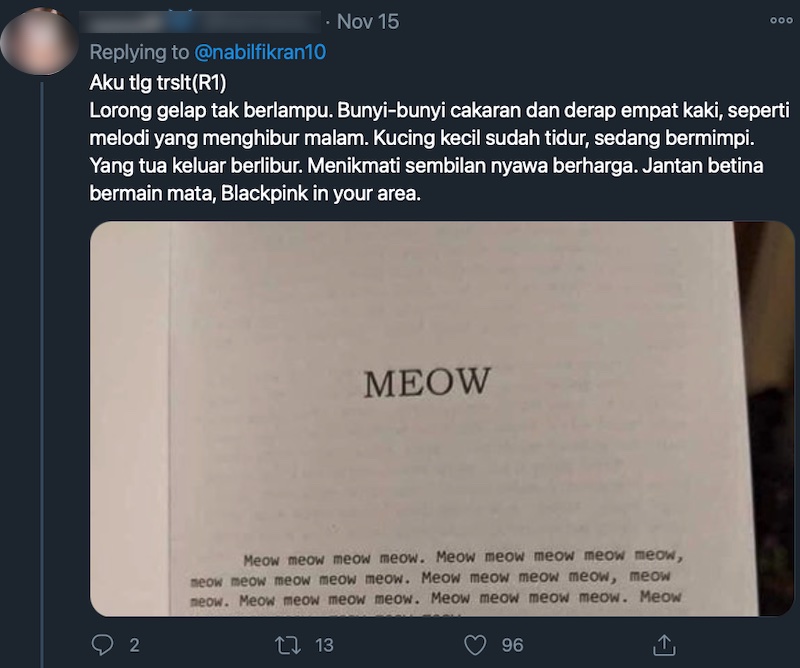 “I regret buying this book; so that’s why it was discounted,” posted @nabilfikran10 on Twitter last Saturday (Nov 14). Photos of the meow-filled pages were shared as a showcase of how unreadable the book turned out to be.
