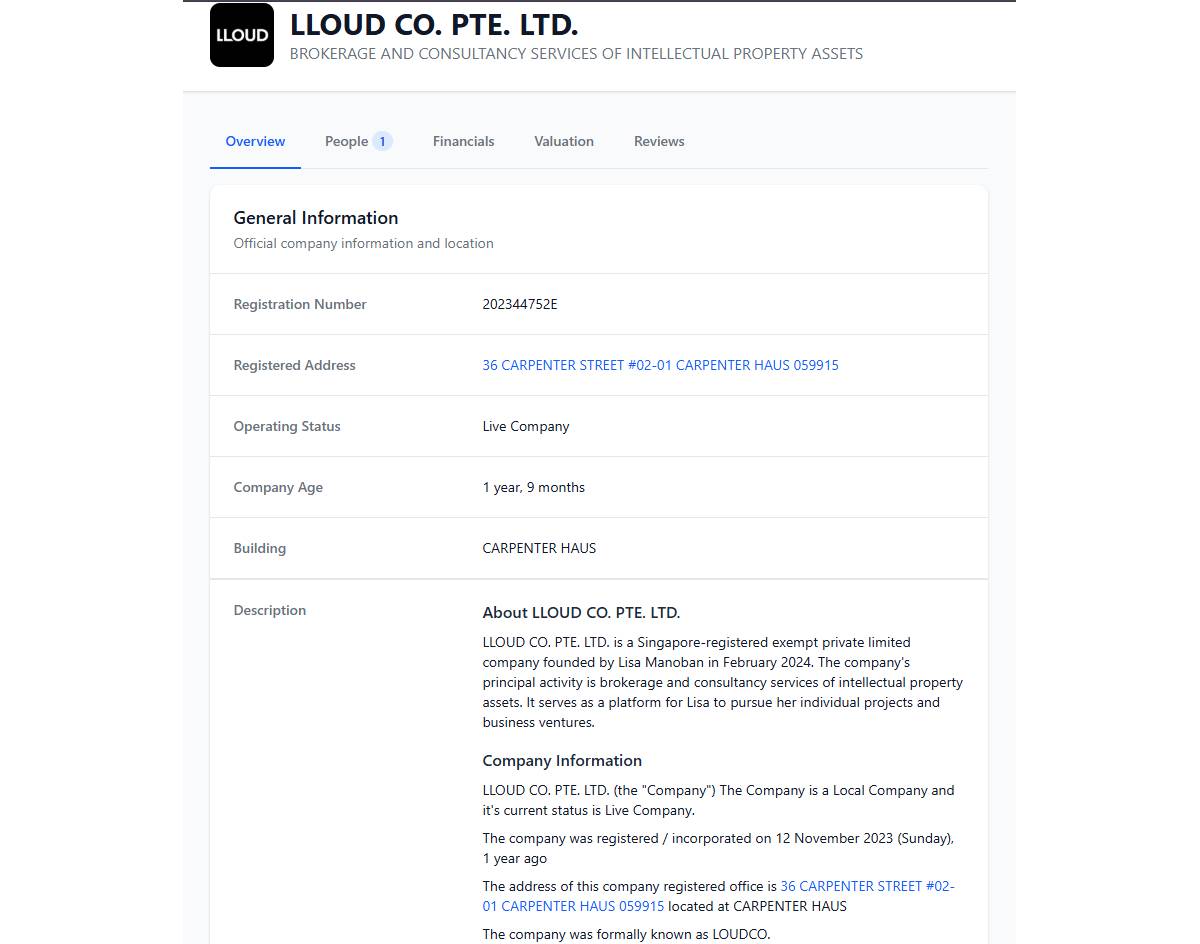 Lalisa Manoban, which is the full name of the singer-dancer, is listed as the company's chief executive officer with the registered address at Carpenter Haus, a co-working space, in the central business district.