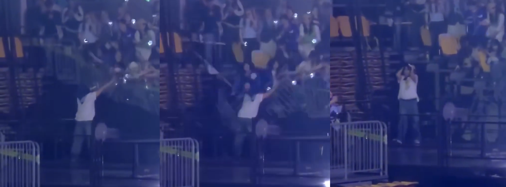 As Elf (Super Junior's fandom name) reached out towards him, the safety fence at the audience area suddenly gave way, resulting in multiple people falling one level down.
