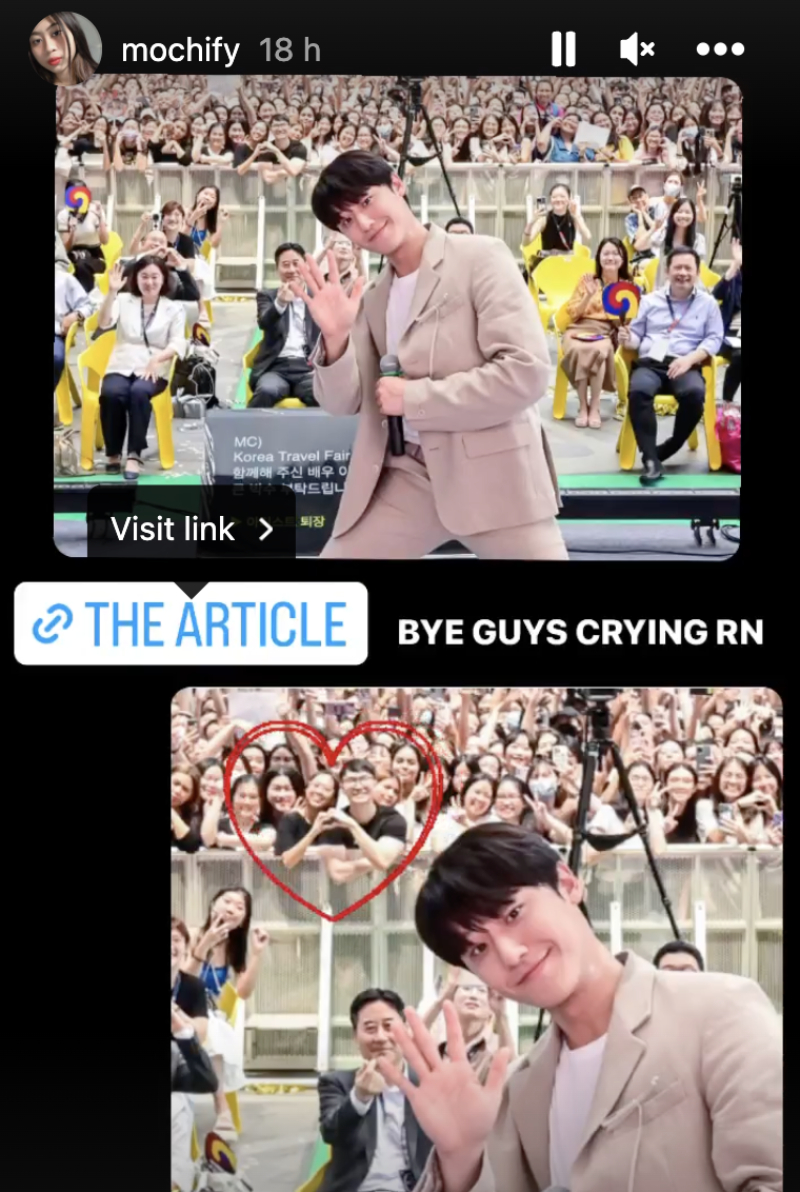Besides getting to see Do-hyun in the flesh, Mochify and her boyfriend also sort of managed to get a picture together with him. In a photo by the Korea Tourism Organisation, Do-hyun posed on stage with guests and fans behind him, and almost right behind the security railings were Mochify and her boyfriend, doing a hand heart.
