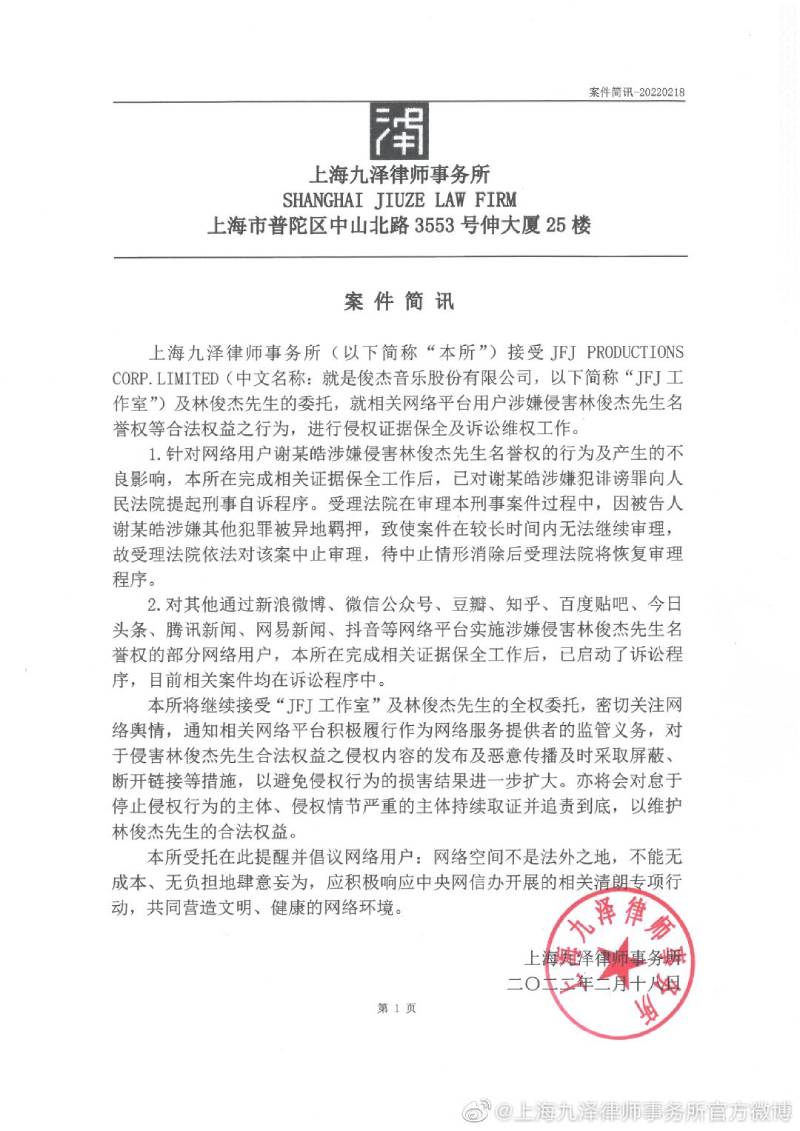 A Chinese law firm, Shanghai Jiuze Law Firm, which says it is representing Lin and his agency JFJ Productions, has begun legal proceedings on behalf of the 40-year-old singer against a person called Xie Minghao.
