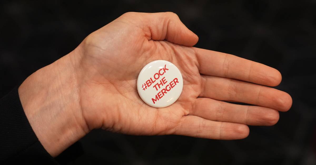 Some attendees at the convention have also been wearing #blockthemerger pins as well.