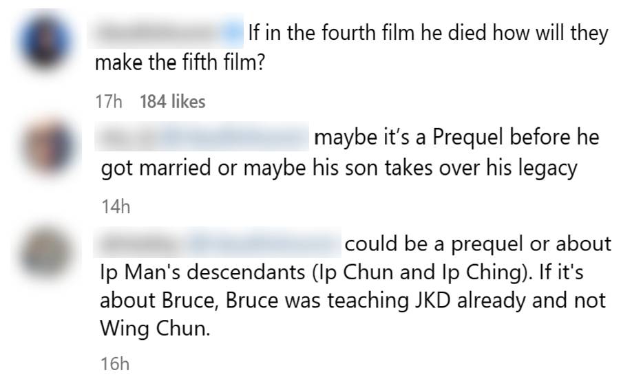 But on a more serious note, a few netizens suspected it may be a prequel to the events that happened in the previous four movies, or a continuation of the last movie, with his sons, Ip Chun and Ip Ching, taking over their father's legacy.