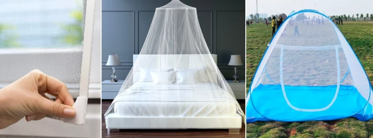 Both mosquito nets and screens work as a physical barrier to protect you from mosquito bites, especially during sleep. They're typically made from a fine mesh material that allows air to pass through for comfort while being dense enough to prevent mosquitoes and other biting insects from entering.