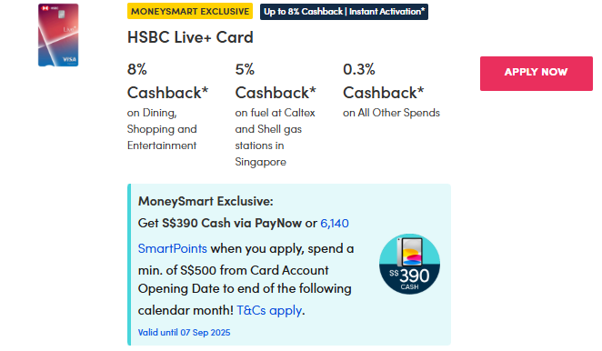 Get eight per cent cashback on dining with the HSBC Live+ Card. Plus, you'll get complimentary access to 1-for-1 dining deals via the ENTERTAINER with HSBC app.