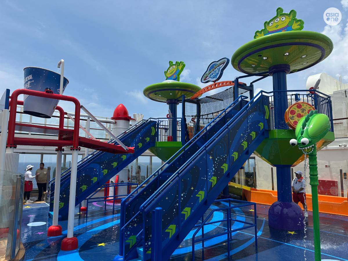 The Flying Saucer Splash Zone is a Toy Story-themed water playground on the upper decks, designed to make guests feel like they are inside a Pizza Planet toy set.