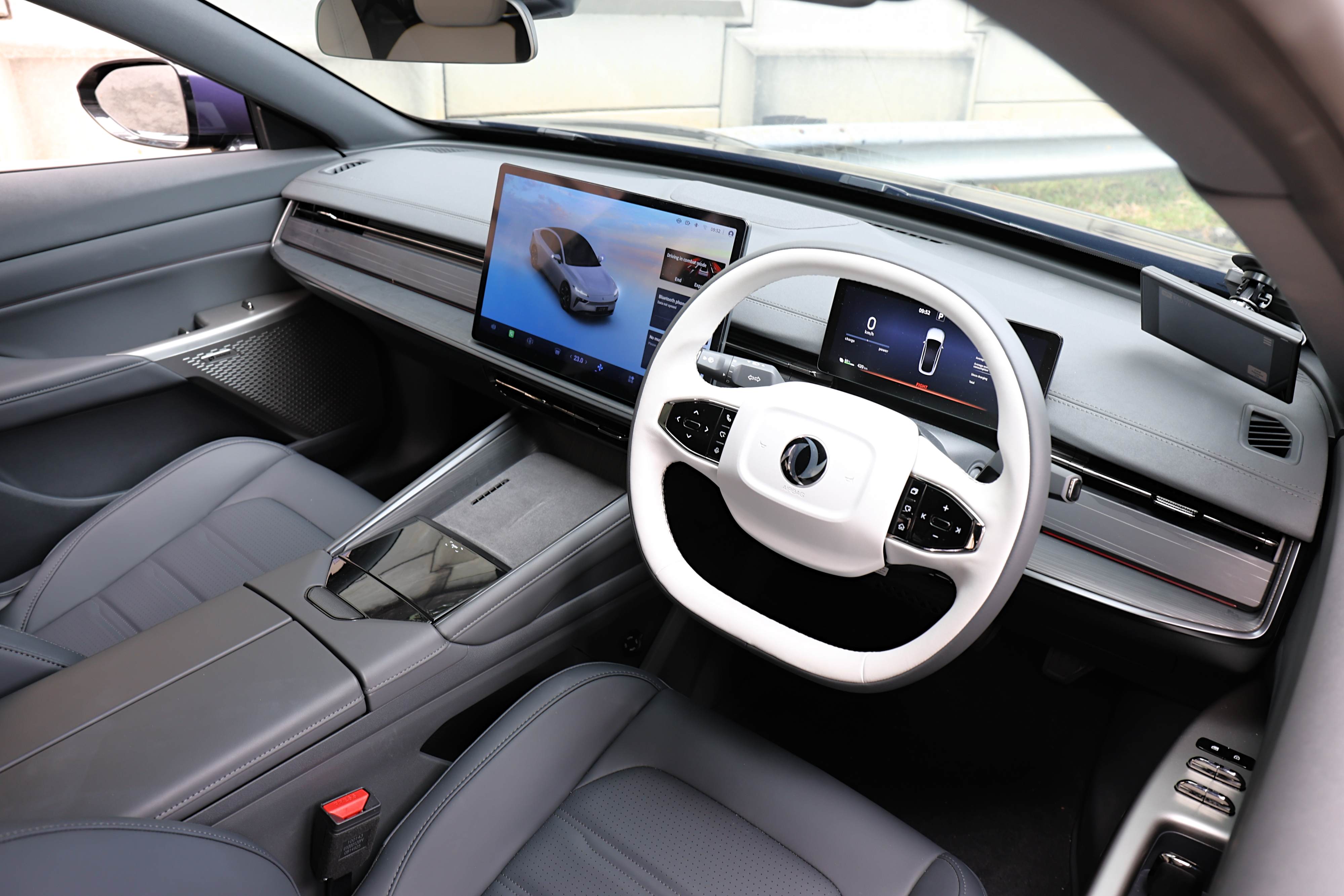 Behind the classy white wheel, the 007 cockpit has the bells and whistles you want in a modern electric sedan, without making things too complicated. Easy luxury is the name of the game, and you're the game master in control.