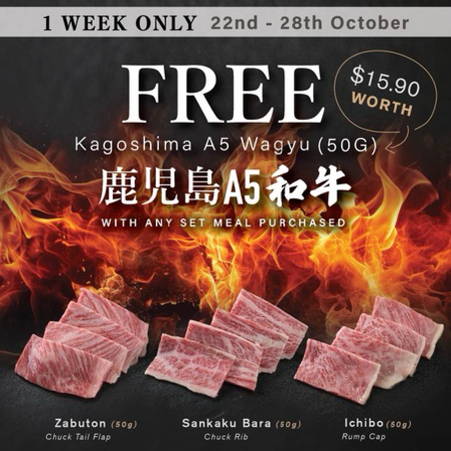 PUBLISHED ONOctober 21, 2024 9:45 AMBYCarol OngWhether you're a wagyu connoisseur or simply looking for a value-for-money treat, you'll be happy to hear that barbecue restaurant chain Yakiniku-Go is offering a free serving of Kagoshima A5 wagyu (U.P. $15.90) with any set meal purchase.