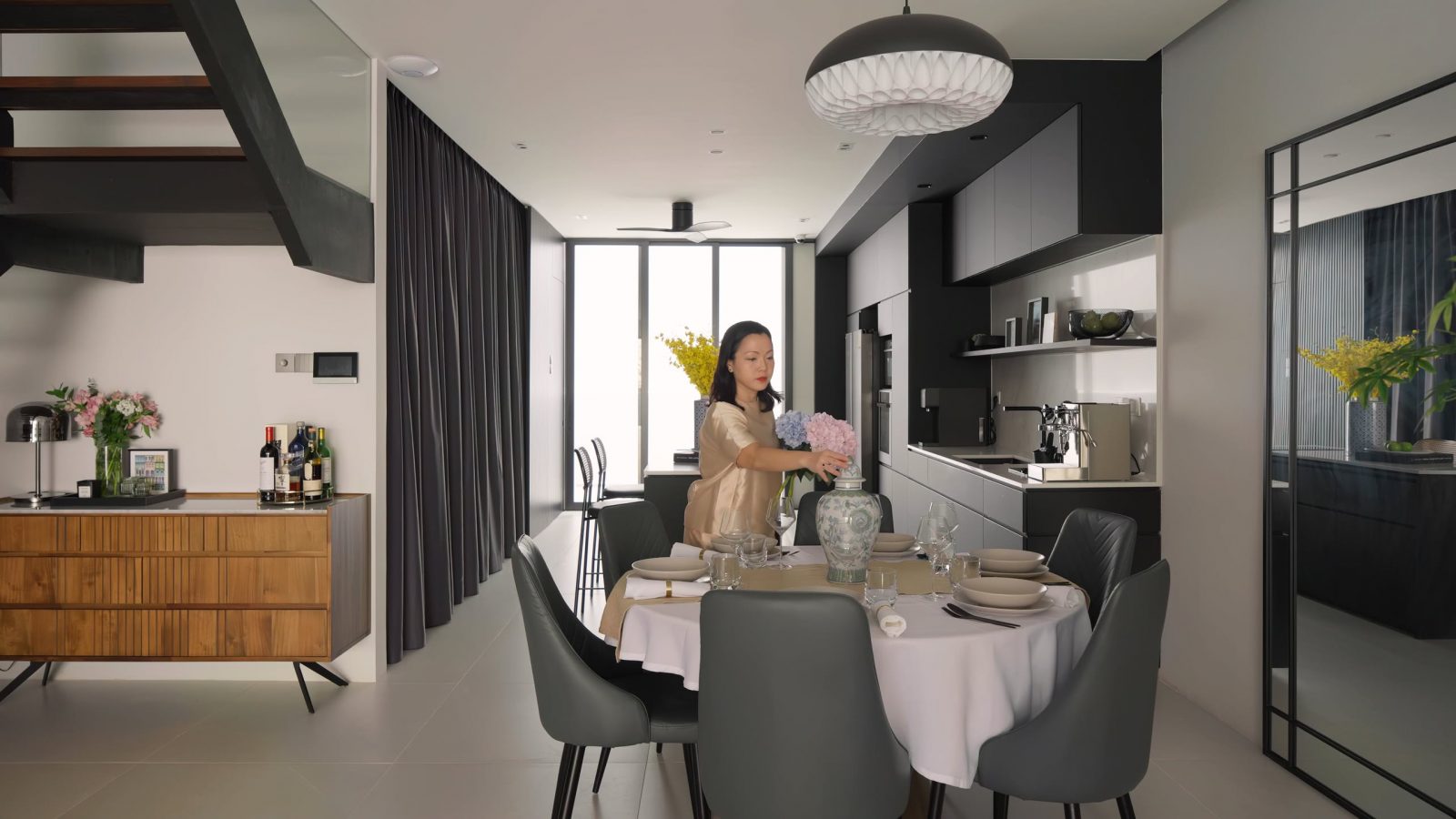 A soft cream-grey palette defines the interior, paired with dark accents in the dry kitchen and richer-toned furnishings. The dining area is designed for conviviality, anchored by a round table, pendant lighting, and mirrored backdrop to create a sense of spaciousness.