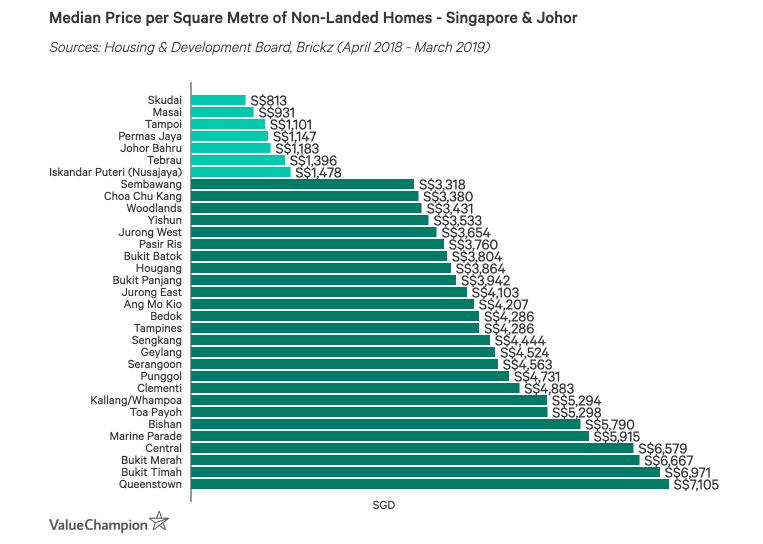 In order to compare prices between areas Singapore and Johor, we compared the median sale price of homes in areas of each. To make a relevant comparison, we used pricing data for HDB resale flats in Singapore and and non-landed flats in areas of Johor with sufficient data.