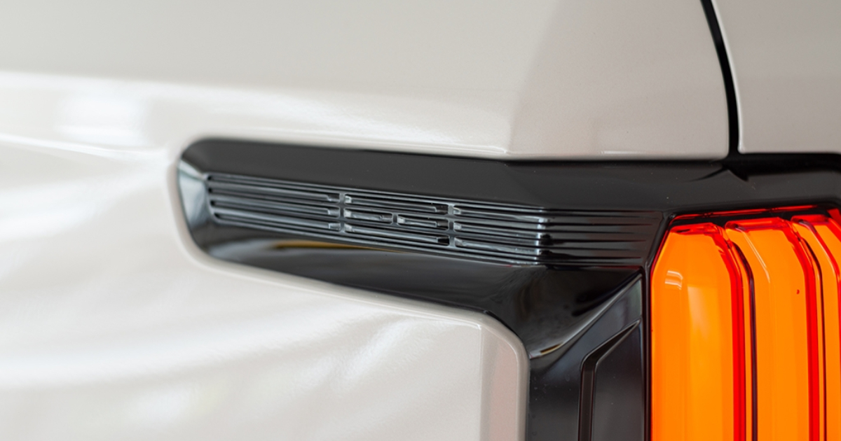The rugged SUV body with plastic cladding and bulging fenders is headlined by its distinct horizontal LED daytime running lights broken up by seven slats, reminding of cars like the Hummer EV, and Jeep's iconic grille elements. The actual head lights are the rectangular units on either side of the front bumper.