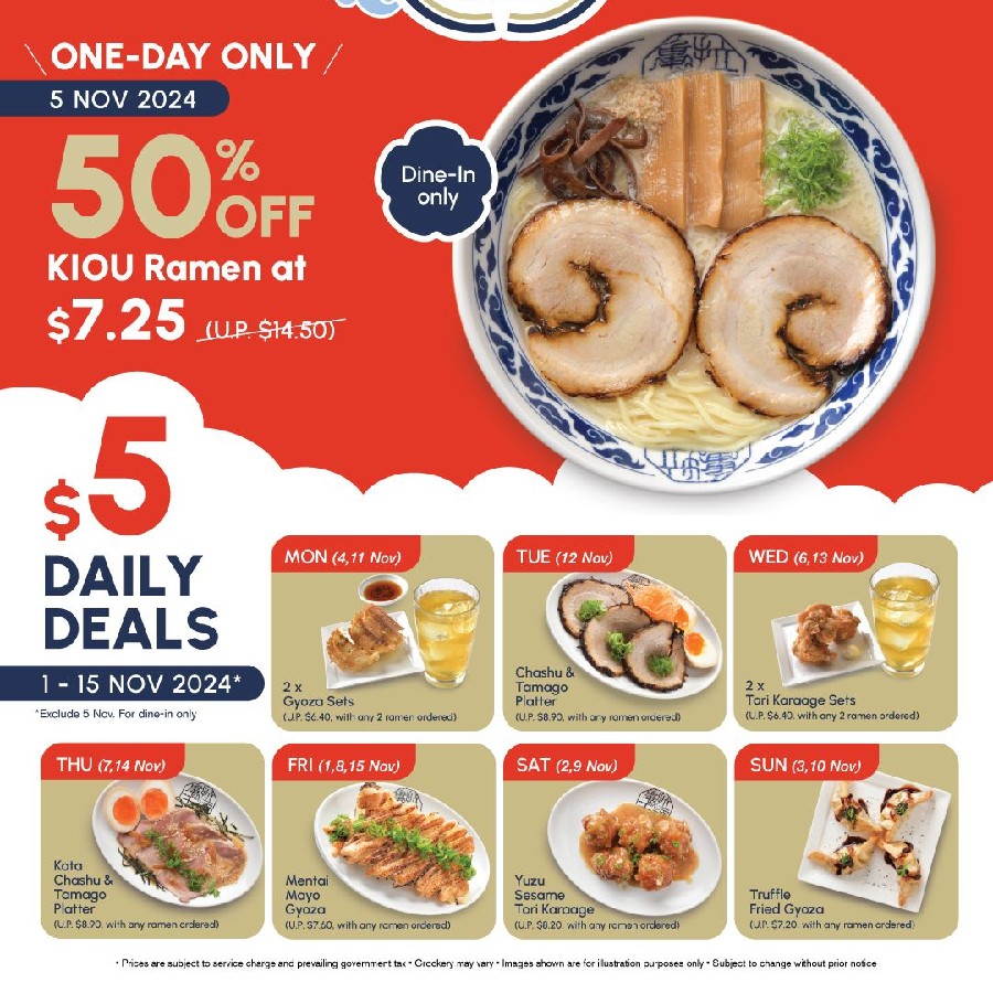 On Nov 5, diners can enjoy their signature Kiou Ramen at 50 per cent off for just $7.25 (U.P. $14.50).