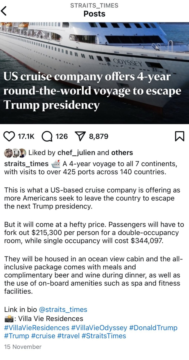 When The Straits Times ran an article on Villa Vie Residences, a US-based cruise line that launched a four-year voyage, there was so much interest that the corresponding Instagram post received 17.1k likes and 8,879 shares in a mere 10 days.