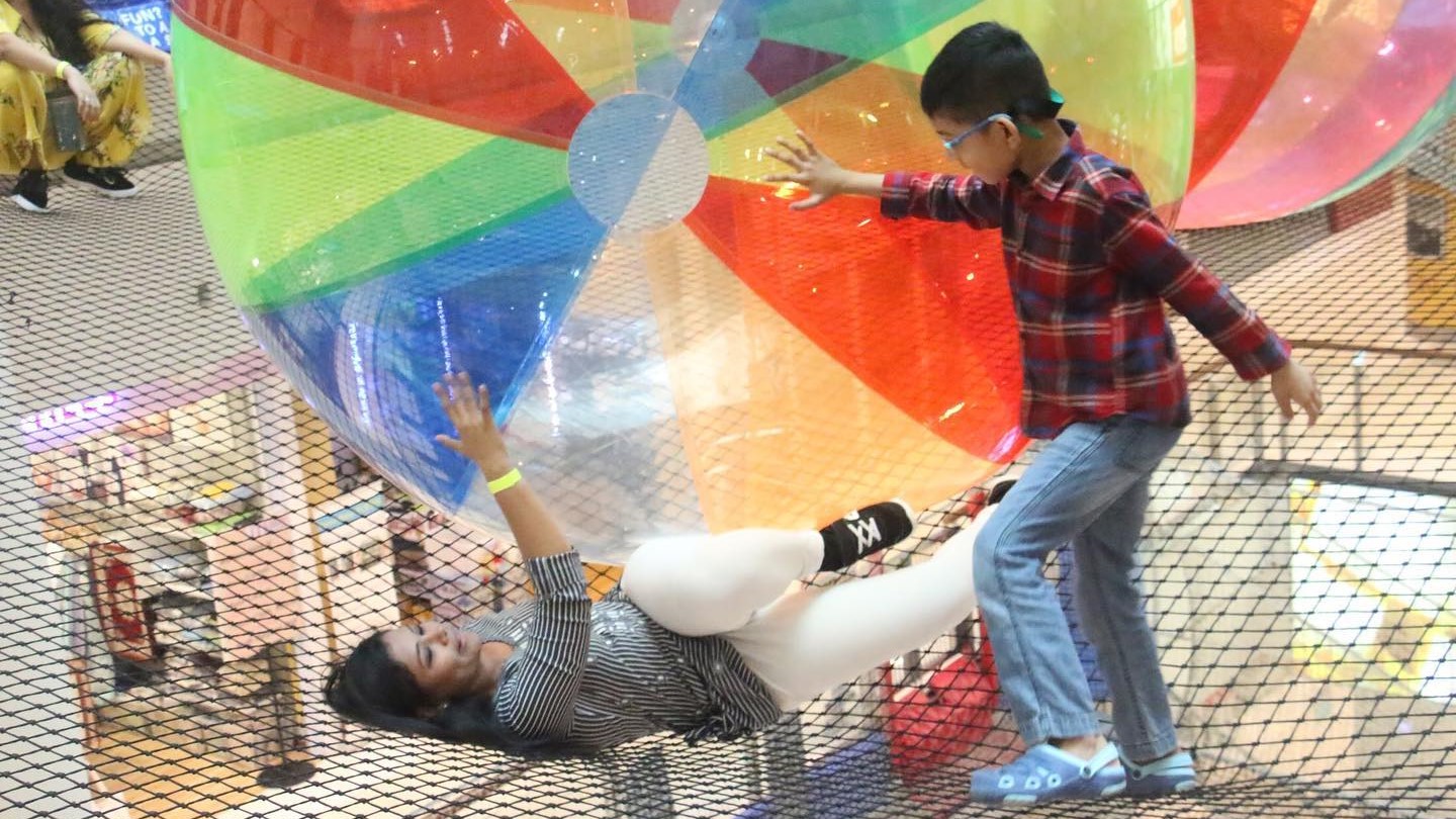 So what can you actually do here? You can lie around, hammock-style, dive into the floating ball pit, explore a 3D maze, slide down a big net bridge and wave at the other mall shoppers.