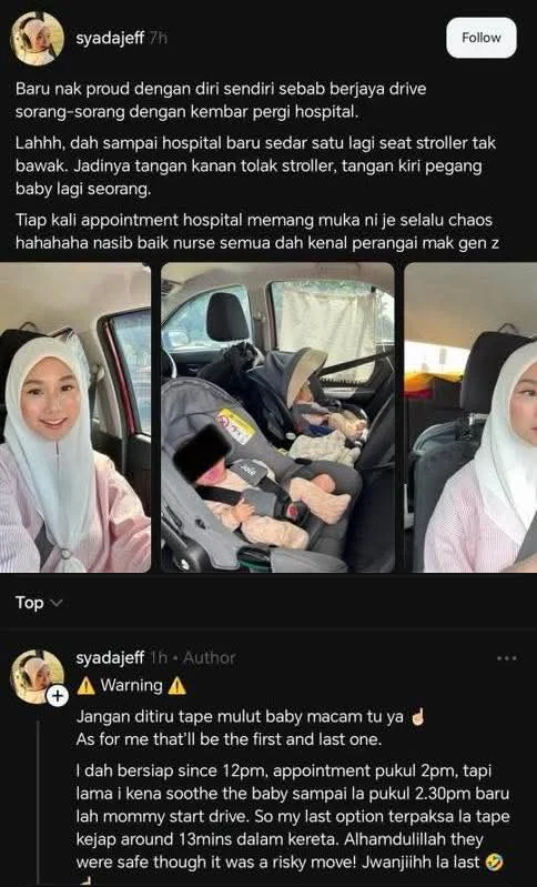Syada made a series of follow-up posts on Thursday (Jan 15), apologising: "I admit it was a stupid solution in that moment and could have jeopardised my babies' safety."