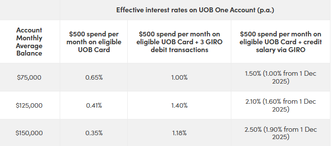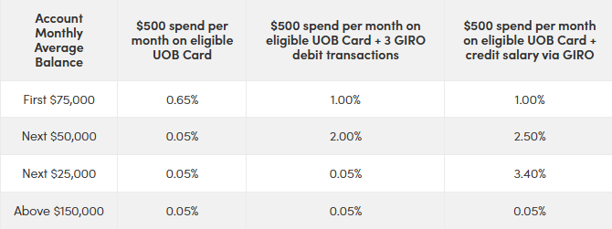 | UOB One Credit min. $1,600 salary + Spend $500/month | 1.00% p.a. (up to first $75,000) You earn: $500 per year (~$42 per month) | 1.38% p.a. (EIR on first $100,000) You earn: $1,375 per year (~$115 per month) Note: The maximum EIR of 1.90% p.a. applies on first $150,000. |