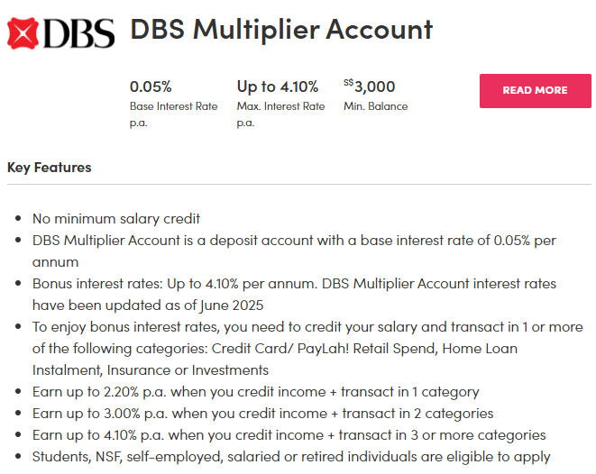 | DBS Multiplier | Up to 4.10% (on first $50,000 – $100,000, fulfil 3 criteria) | Salaried workers |