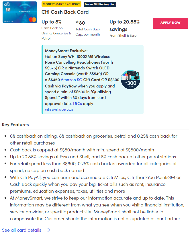 The Citi Cash Back+ Card currently plays second fiddle to UOB's Absolute Cashback card, offering 1.6 per cent cashback on all spending.
