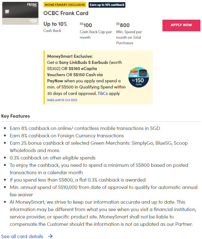 Like the DBS Live Fresh Card, the OCBC FRANK Credit Card is also offering higher cashback if you go green. You can enjoy an additional two per cent cashback when you shop at selected eco-friendly merchants, such as Scoop Wholefoods, Little Farms, SimplyGo, and BlueSG.