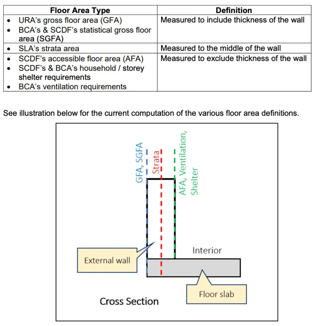 Today, URA uses gross floor area (GFA) to measure building intensity, but the current measurement includes the full thickness of external walls and excludes voids.