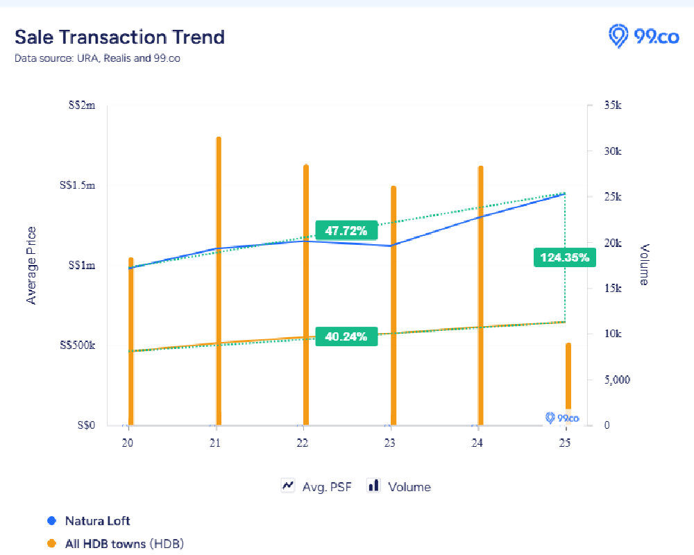 Properties with higher entry points, such as The Peak @ Toa Payoh and City View @ Boon Keng, typically show a softer pace of price appreciation. However, Natura Loft @ Bishan seems to defy this trend.