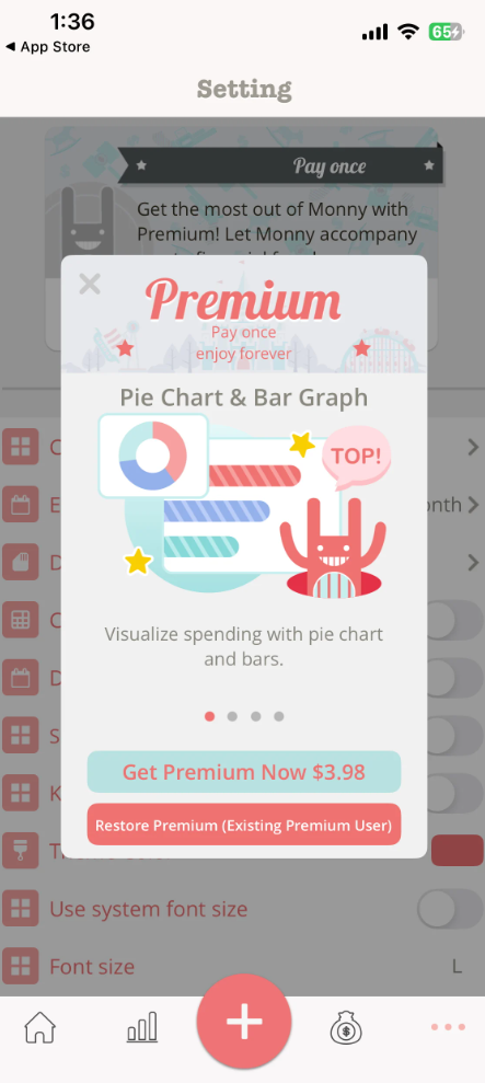 Unlock the premium version with a one-time purchase ($3.98) to access charts of your top 10 expenses, annual spending trends graphs and pie charts of your monthly spending broken down by category. Plus, you'll have an ad-free experience and passcode lock as an added security feature.
