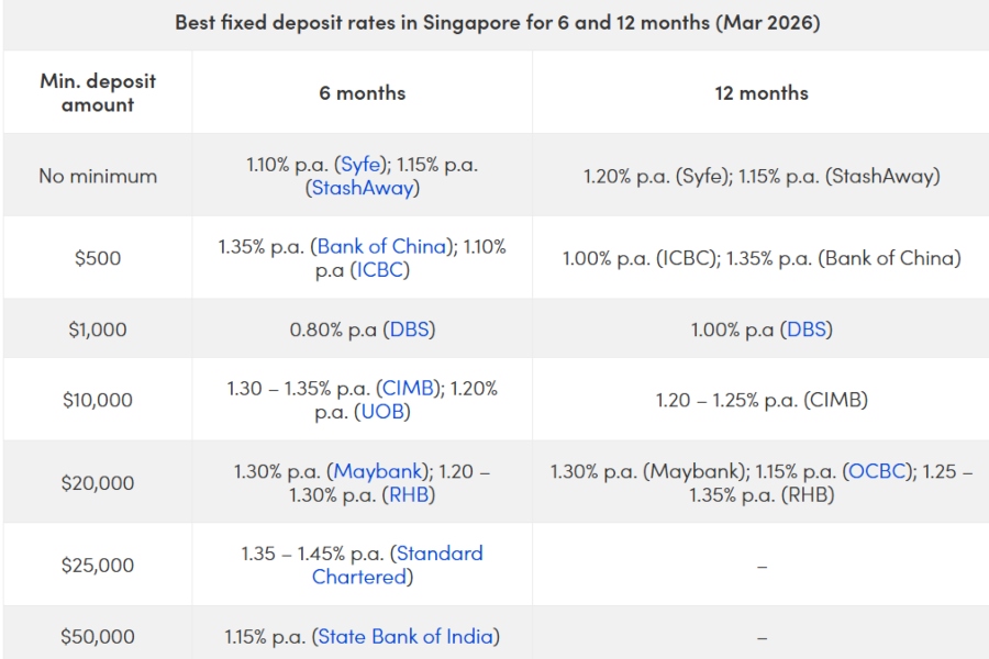 Best fixed deposit rates in Singapore (March 2026): Minimum deposits from $500, rates up to 1.5%