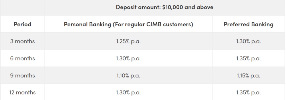 Malaysian bank CIMB is offering relatively good fixed deposit rates in Singapore this month, at up to 1.30 per cent p.a. for regular CIMB customers and 1.35 per cent p.a. if you're a CIMB Preferred Banking customer. These aren't high in absolute terms, but they are some of the highest this month compared to rates offered by other banks.