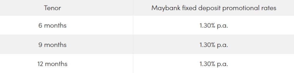 Note: The rates above are promotional rates subject to change at any time by Maybank. Check the Maybank fixed deposit rate page for the latest rates.