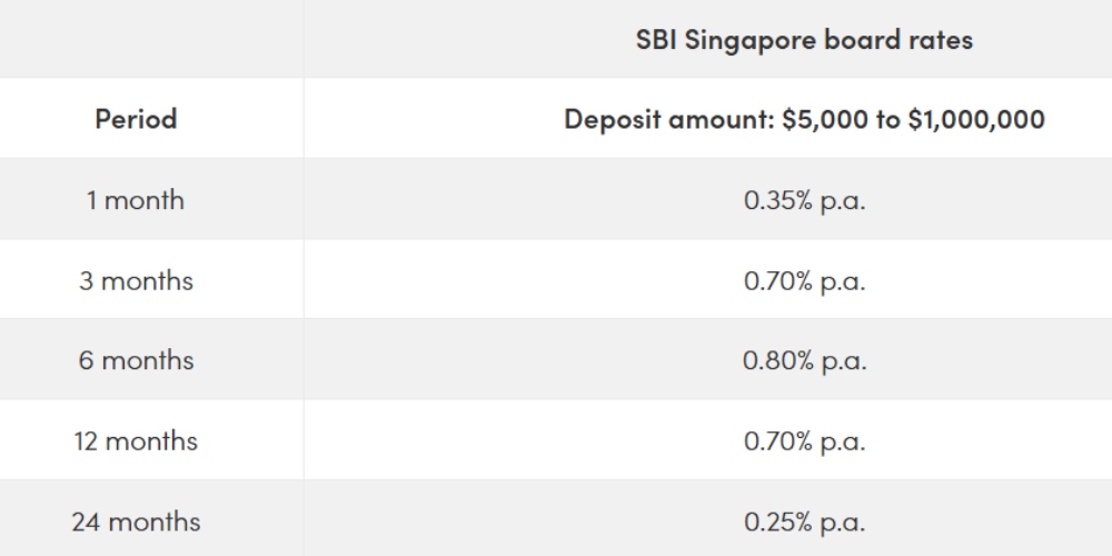 The State Bank of India is currently offering one promotional fixed deposit rate for a minimum deposit of $50,000: 1.15 per cent p.a. for a tenor of six months. While $50,000 isn't exactly a small sum of money, at least the interest rate is comparable relative to other banks this month.