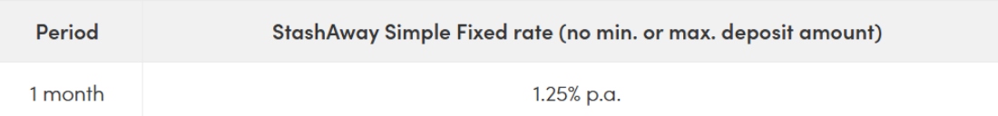 As of March 3, 2026, the StashAway Simple Fixed interest is 1.25 per cent p.a. for a one-month period, with no minimum or maximum deposit amounts.