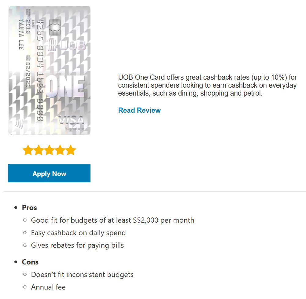 Similarly, the UOB One credit card is another great option which gives you up to 15 per cent cashback at selected partners such as Shopee, Cold Storage, Giant, Guardian and even SimplyGo.