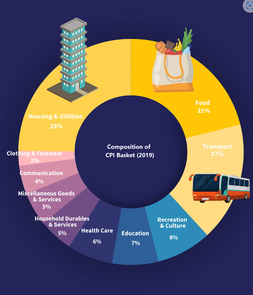 We see the weightage of different types of goods and services used in constructing the CPI basket in Singapore in the infographic below.