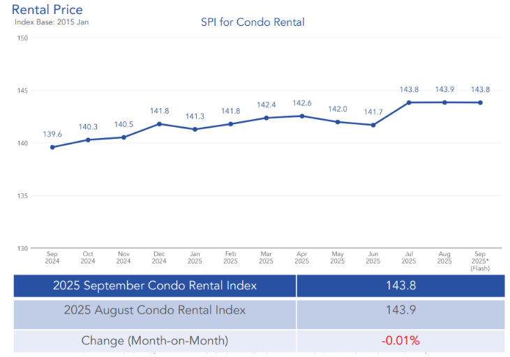 In September 2025, overall condo rents were largely stable, slipping by just 0.01 per cent month-on-month. Across regions, performance varied slightly — rents in the Core Central Region (CCR) rose 0.8 per cent, while those in the Outside Central Region (OCR) fell 0.5 per cent. Meanwhile, the Rest of Central Region (RCR) stayed unchanged from August.