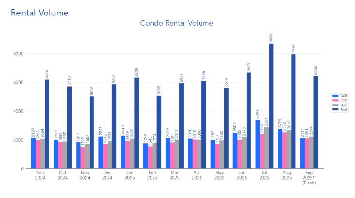When it comes to leasing activity, though, there was a more noticeable drop. Rental volumes fell by 18.9 per cent month-on-month, with an estimated 6,446 units rented in September — down from 7,949 units in August.