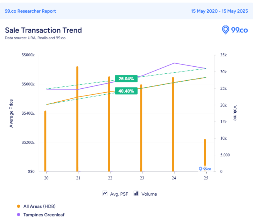 Since 2021, average resale prices for 2-room units at Tampines Greenleaf have risen by 46.95 per cent. In comparison, the nationwide growth rate for this flat type over the same period is 33.46 per cent.