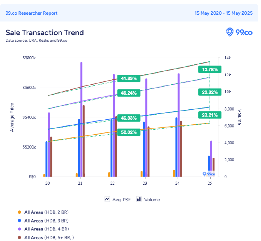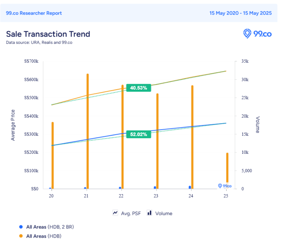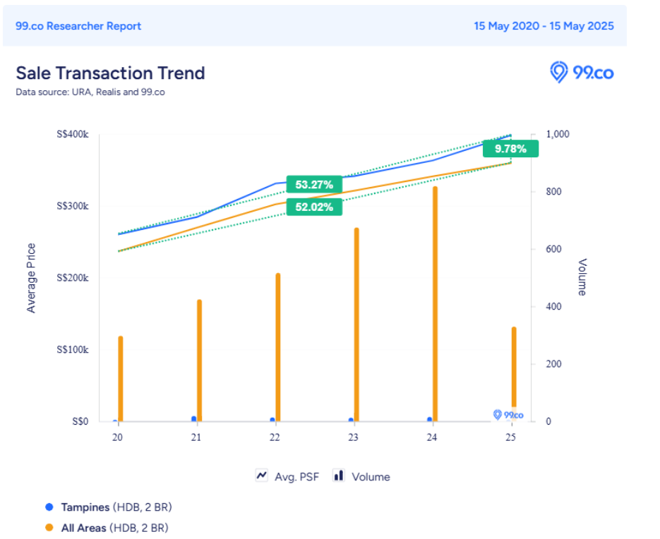 Still, this trend isn't exclusive to Tampines. The percentage growth in prices over the past five years for 2-room flats here is closely in line with what's happening across Singapore. In short, the rising demand and pricing for 2-room flats is not isolated — it's part of a broader islandwide trend.