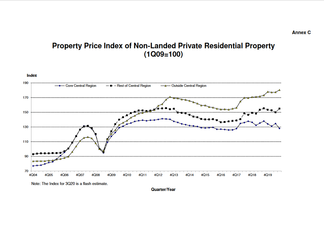 Private non-landed homes in the RCR are estimated to have risen 3.3 per cent, while properties in the OCR have risen 1.7 per cent. Properties in the CCR have fallen by 4.9 per cent.