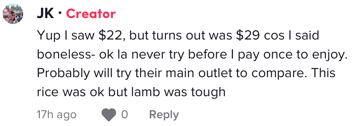 He thought the dish was going to set him back by $22, but he ended up paying $29 because he opted for boneless mutton.