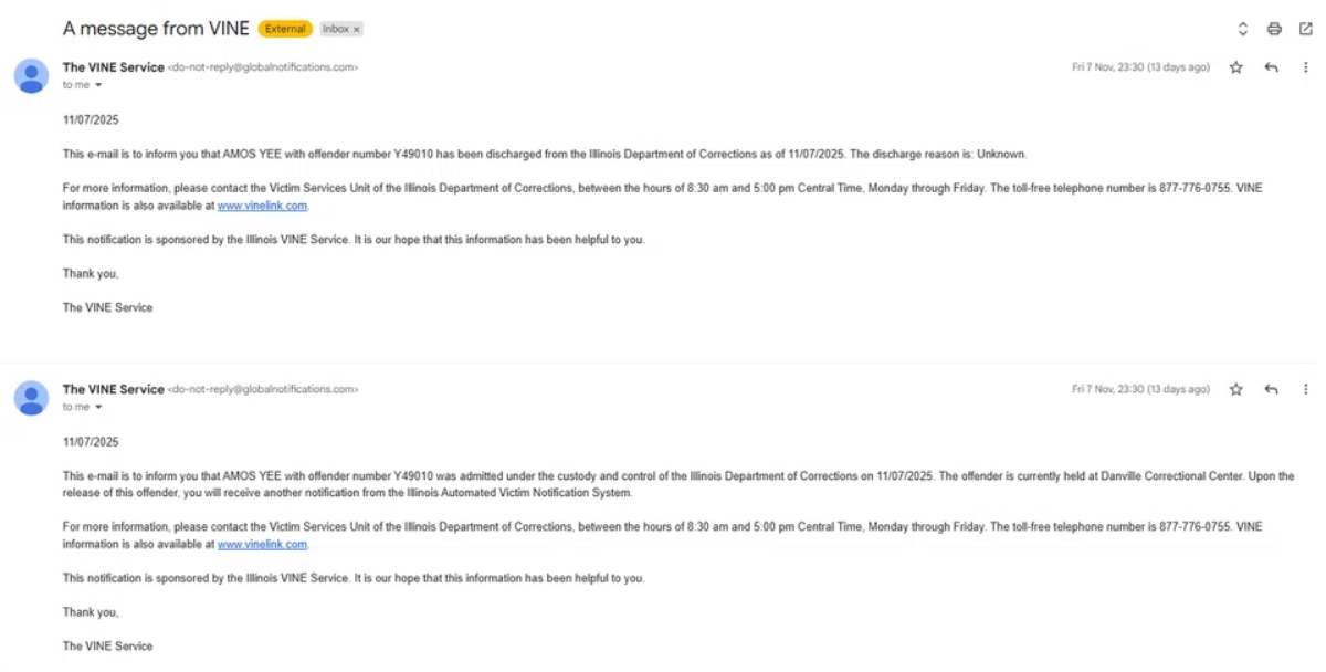 A notification from the Victim Information and Notification Everyday, or VINE, service at 7.14am Illinois time (9.14pm Singapore time) said Yee was let out of prison.