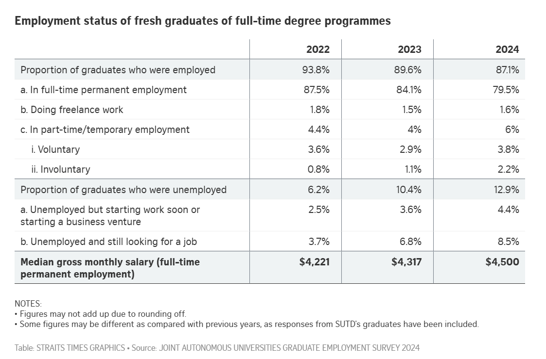 But those who did find full-time jobs saw higher earnings with the median gross monthly salary at $4,500 in 2024, up from $4,317 in 2023.