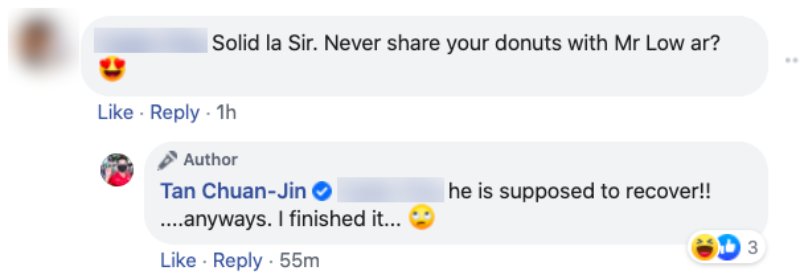 And netizens appear to have caught on Tan's penchant for donuts and asked if he treated Low to his favourite snack. With the latter still in recovery, however, the donuts would just have to wait.