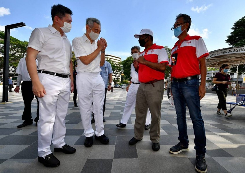 Prime Minister Lee Hsien Loong and PAP's Henry Kwek exchanged pleasantries with PSP's Kumaran Pillai at Mayflower Market and Food Centre.