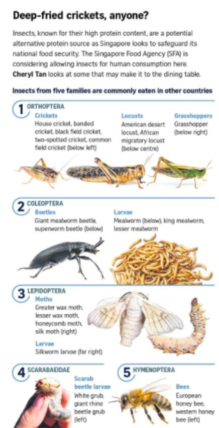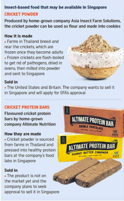SFA told The Straits Times in October 2022 that it had conducted a scientific review and assessed that specific species of insects with a history of human consumption can be eaten, either directly, or made into items such as snacks.