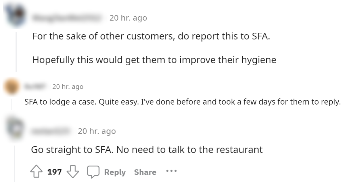 "SFA takes a serious view towards food safety and will investigate all feedback alleging poor food safety practices," they added.