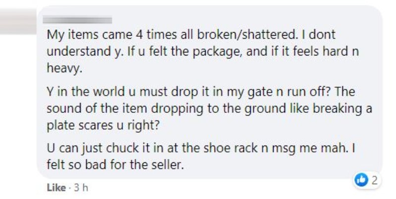 As of writing, his Facebook post garnered 974 likes, 362 comments and 3,500 shares, with netizens quick to chide the delivery staff for her poor handling of the parcel.