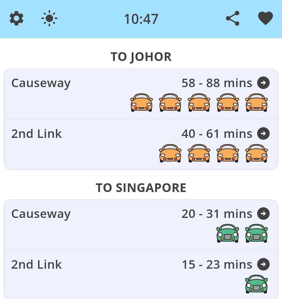 According to the Clear The Jam app, wait times for traffic towards Johor were estimated to be 58 to 88 minutes on the Causeway and 40 to 61 minutes on the Second Link at 10.47am on Sunday (March 16).